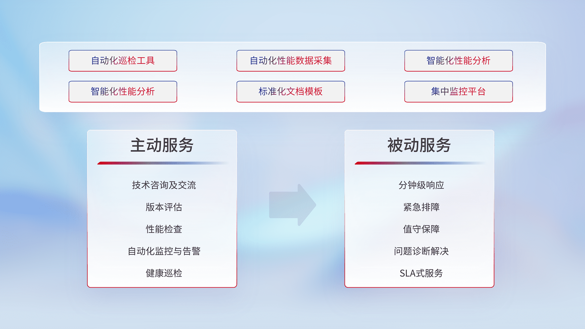 智能化工具和标准化文档,,,,保障服务质量,,,提供主动服务(包含技术咨询、、、版本评估、、性能检查、、、自动化监控与告警、、健康巡检)和被动服务包含(分钟级响应、、、、紧急排障、、值守保障、、、、问题诊断解决、、、、SLA服务)。。。。