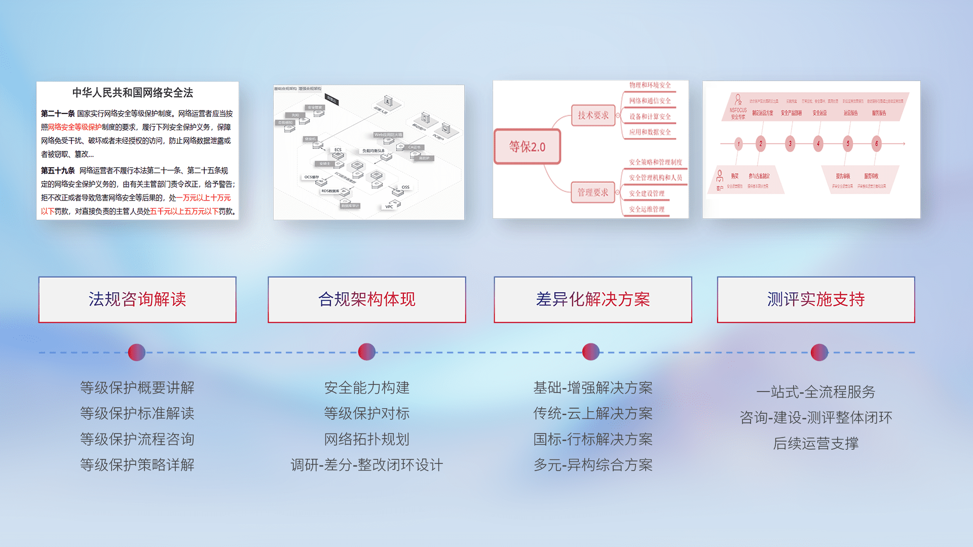 通过专业的法律咨询解读、、、、合规架构体现、、差异化解决方案、、测试实施支持等服务,,为客户量身打造等保合规体系。。。
